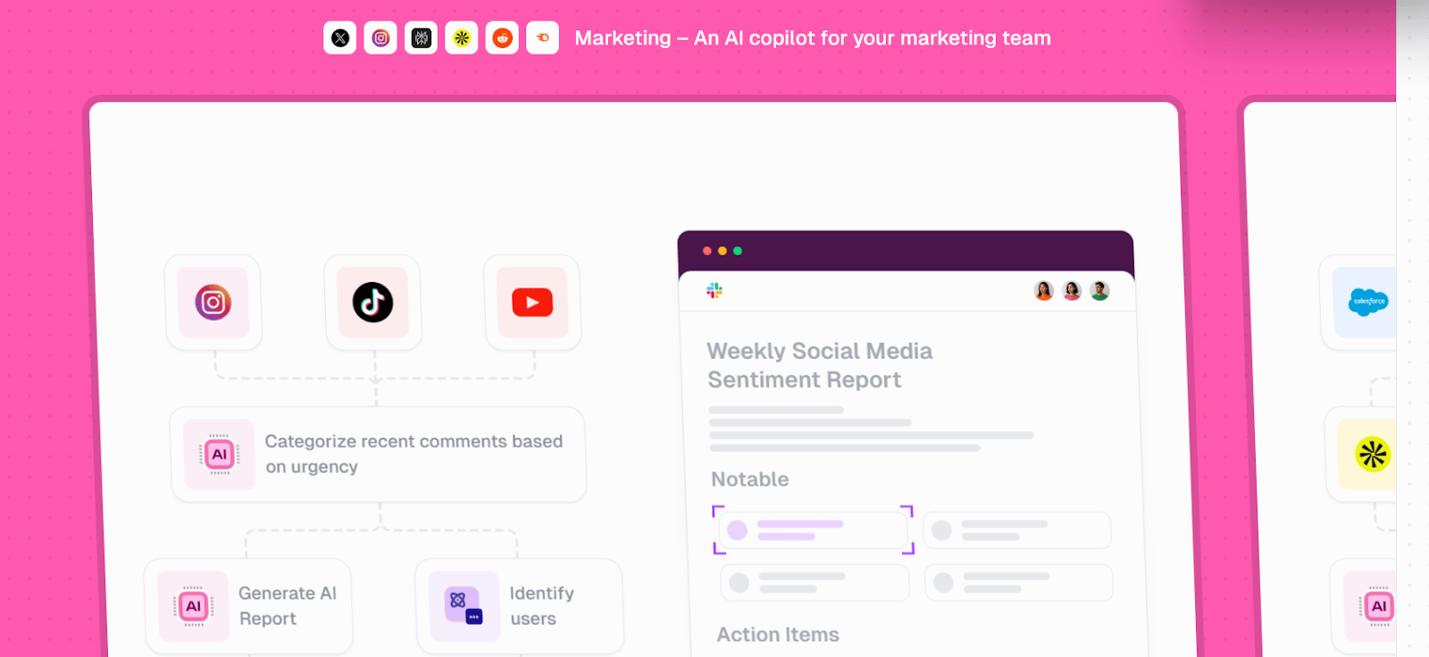 Platforms like Salesforce Agentforce, HubSpot AI Agents, or Typeface Arc Agents provide pre-built agent systems specifically designed for marketing.