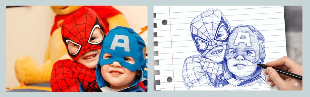 ”Create a photo-style line drawing/ink sketch of the faces identical to the uploaded reference image — keep every facial feature, proportion, and expression exactly the same. Use blue and white ink tones with intricate, fine line detailing, drawn on a notebook-page style background. Show a right hand holding a pen and an eraser near the sketch, as if the artist is still working.”