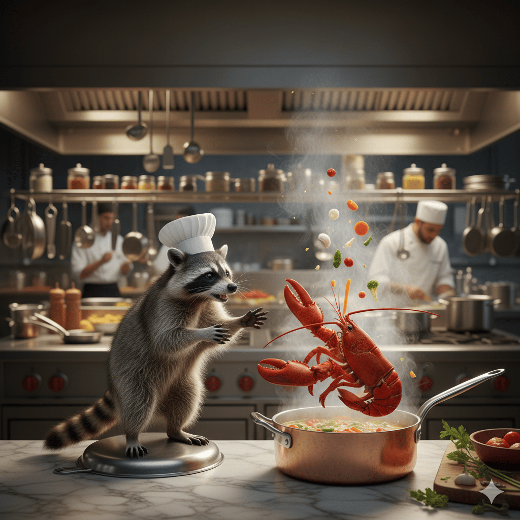 Here’s a photorealistic image of a raccoon wearing a tiny chef's hat and arguing with a lobster over a pot of soup in a Michelin-star kitchen.