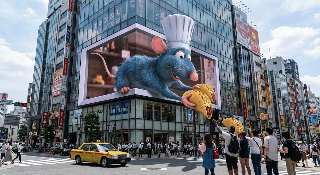 [An adorable giant ratatouille handing out tacos to passing pedestrians, it's blue just like in the animation, with a chef's hat extending realistically into the space around the screen.]
